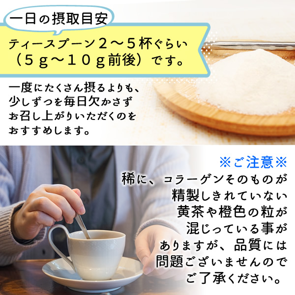 | 当商品は一番搾りの臭いが少ないコラーゲンで形状は顆粒となっており、水などの液体にもよく溶けますので、コーヒーやお茶などのお飲み物・カレーやシチュー、お味噌汁やスープの中に 入れていただく方法がおすすめです。 一日の摂取目安は、ティースプーン2〜5杯ぐらい(5g〜10g前後)です。 ※ご注意※稀に、コラーゲンそのものが精製しきれていない黄茶や橙色の粒が混じっている事がありますが、品質には問題ございませんのでご了承ください。 |