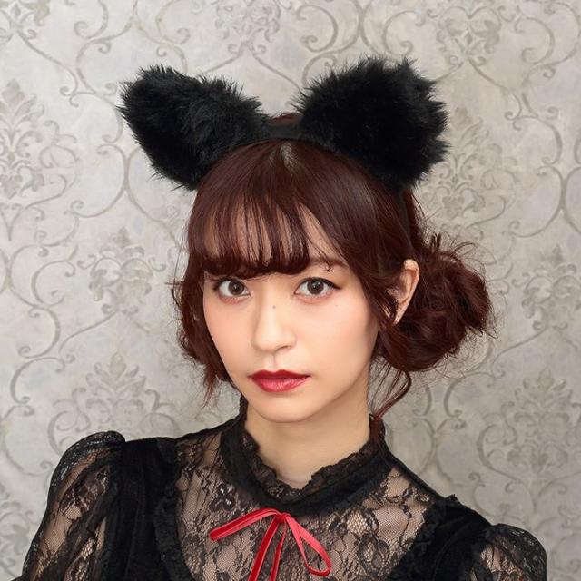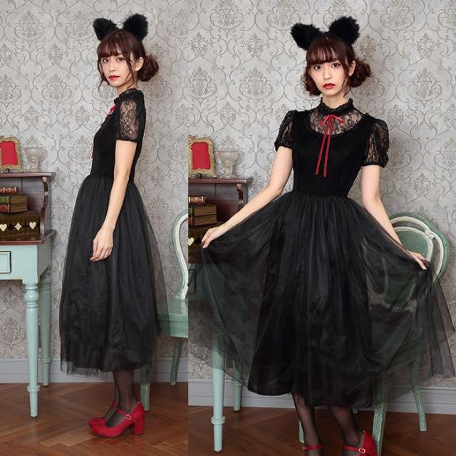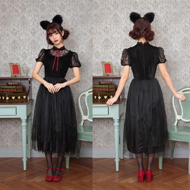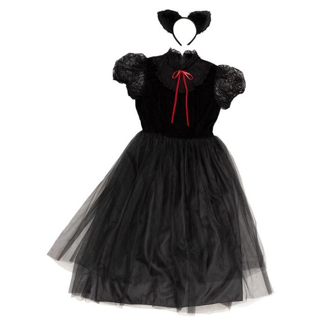 ロング丈コスチューム。ブラックカラーとロング丈がクラシカルな印象。スカート部分の2枚のチュールは丈が違うのでふんわり立体的に見えます。毛足の長いファーを使用したねこ耳カチューシャもインパクト大!胸元や袖のレースもエレガントです。コスプレ初心者やママにもおすすめ。