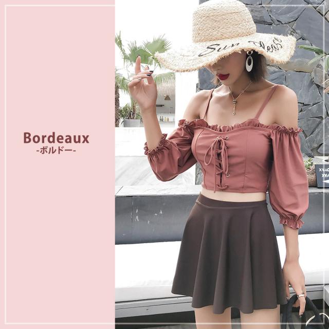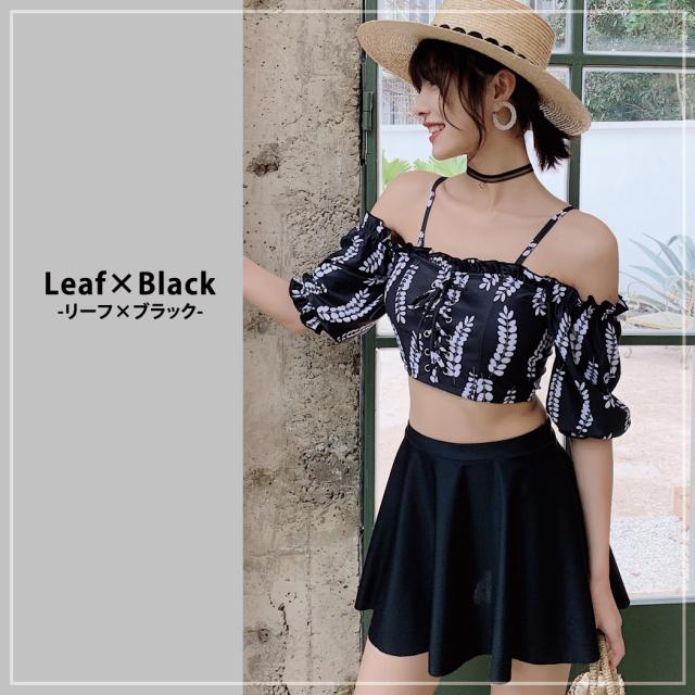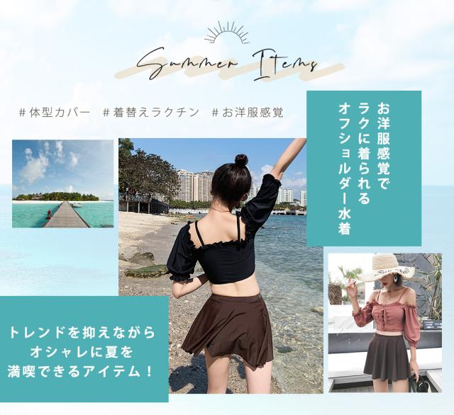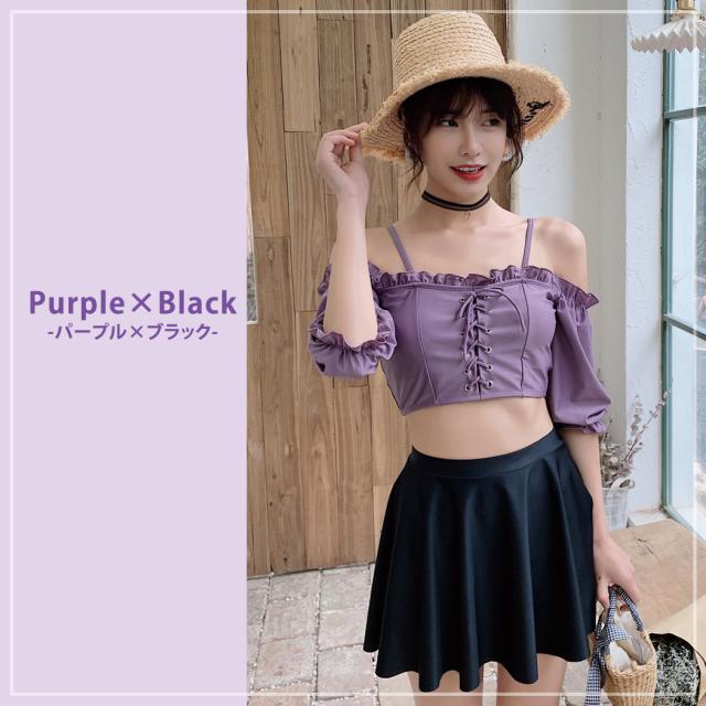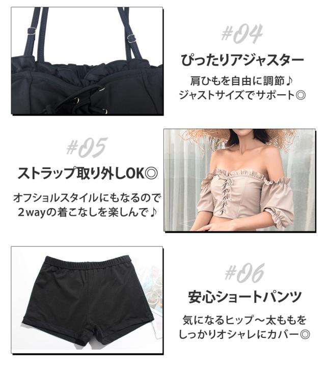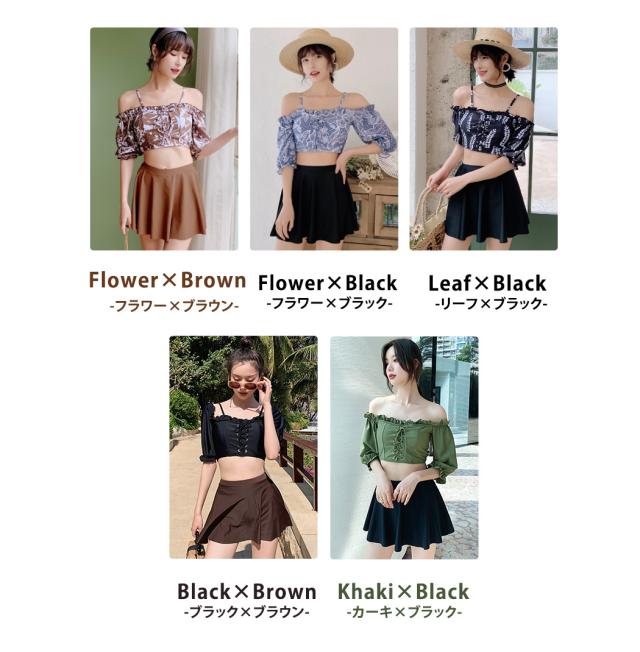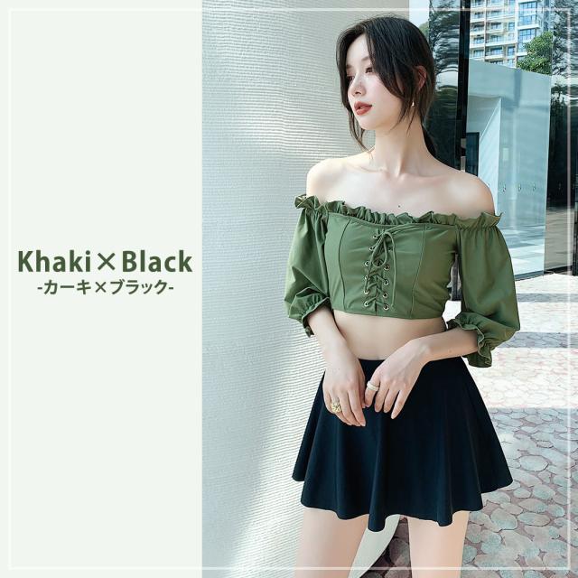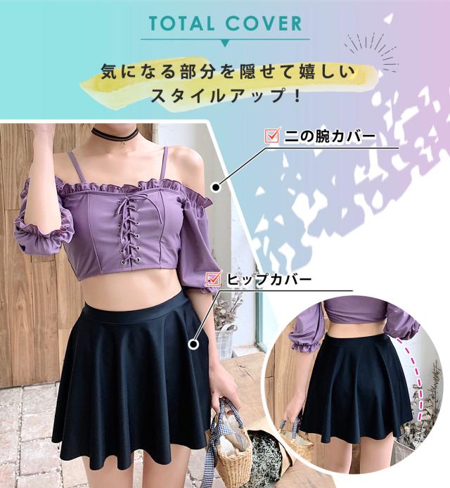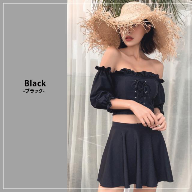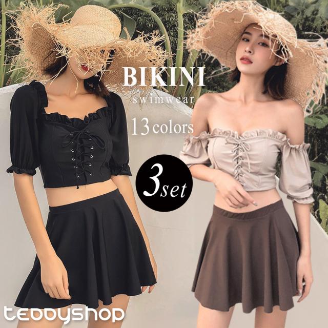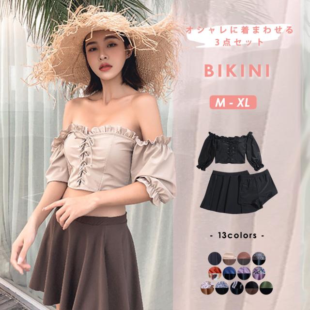 水着 レディース ビキニ オフショルダー 2way フリル スカート 3点セット 体型カバー水着 ぽっちゃり 20代 30代 ママ水着 バックフリル セクシー シンプル レースアップ オトナ女子 パッド付き バスト 盛れる 二の腕 お腹 お尻 太もも カバーアップ 黒