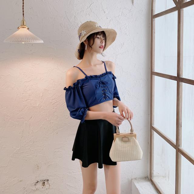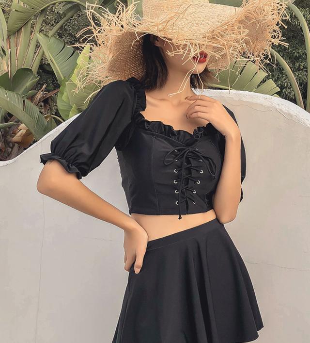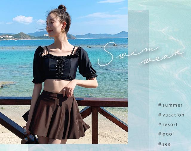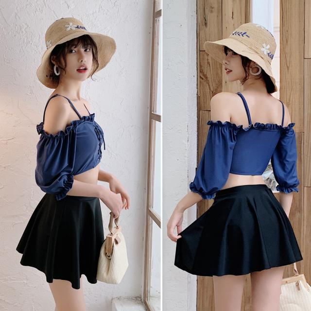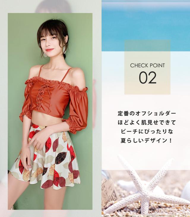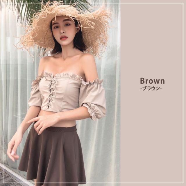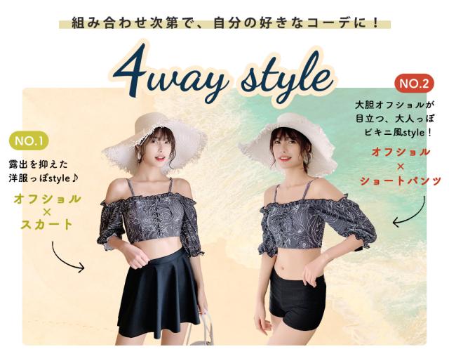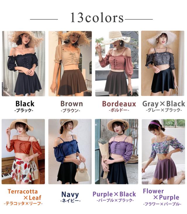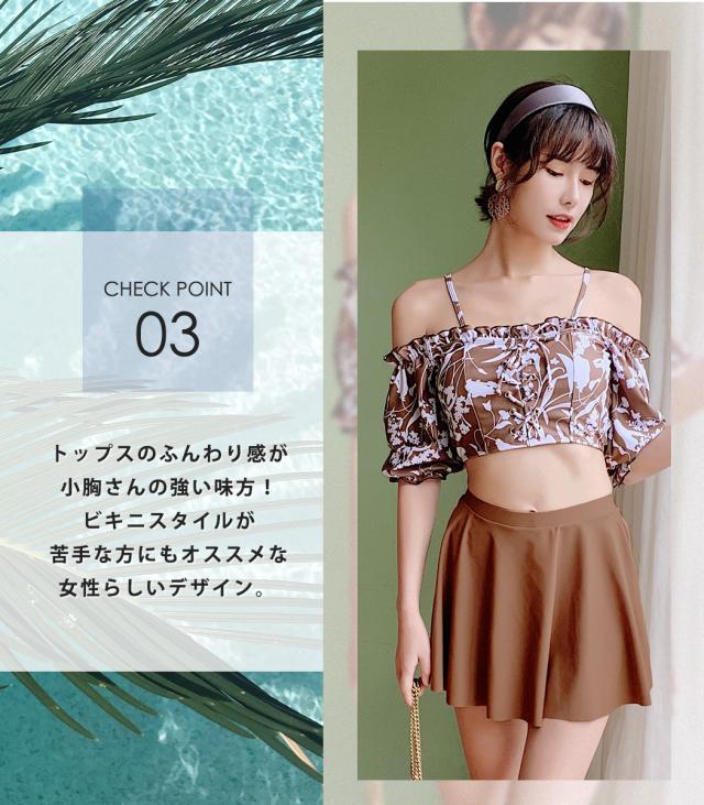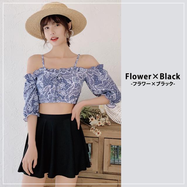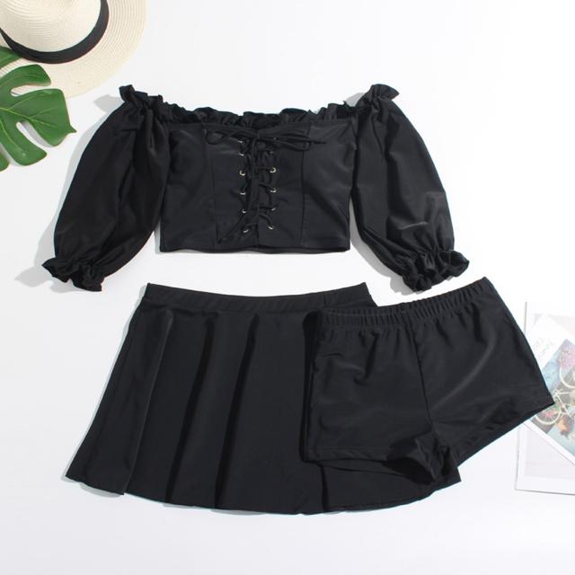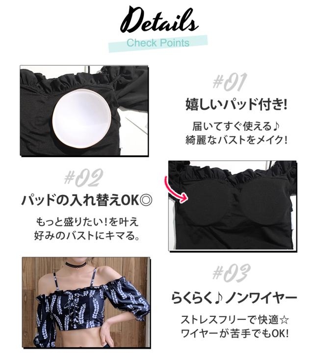 水着 レディース ビキニ オフショルダー 2way フリル スカート 3点セット 体型カバー水着 ぽっちゃり 20代 30代 ママ水着 バックフリル セクシー シンプル レースアップ オトナ女子 パッド付き バスト 盛れる 二の腕 お腹 お尻 太もも カバーアップ 黒