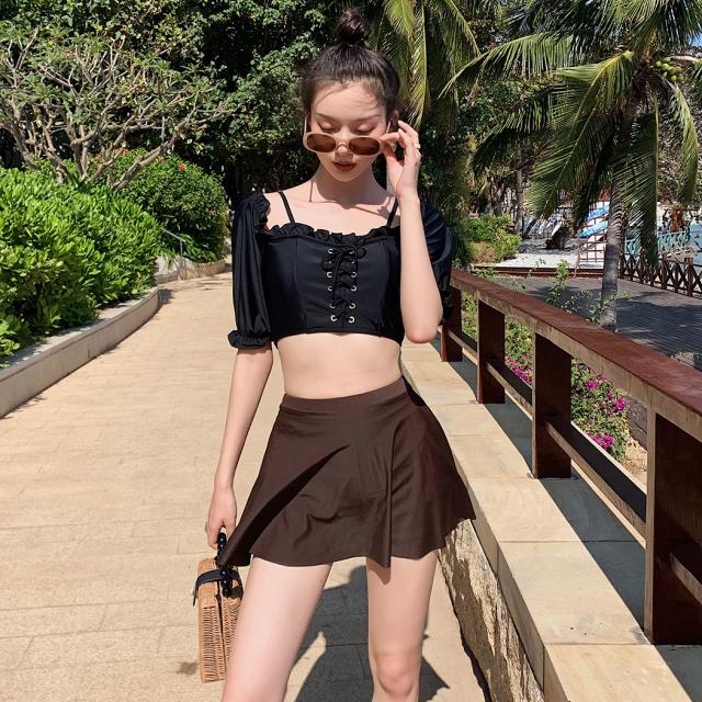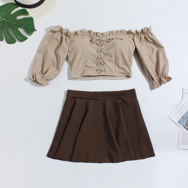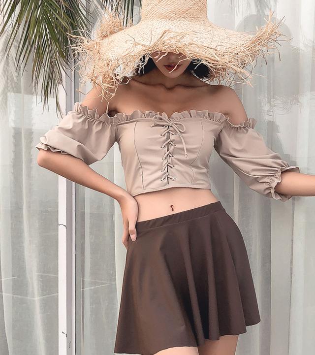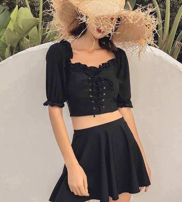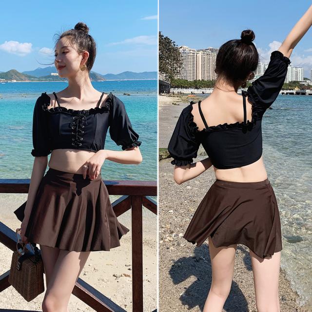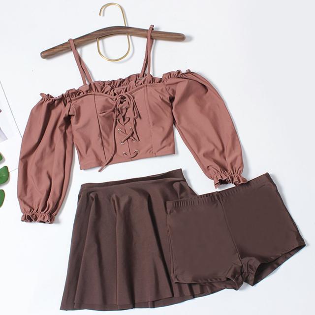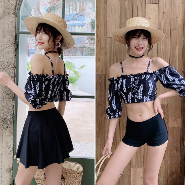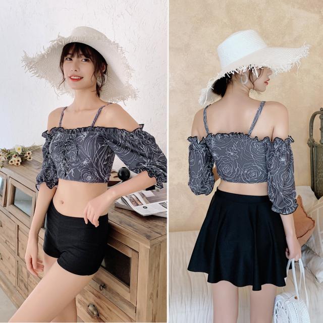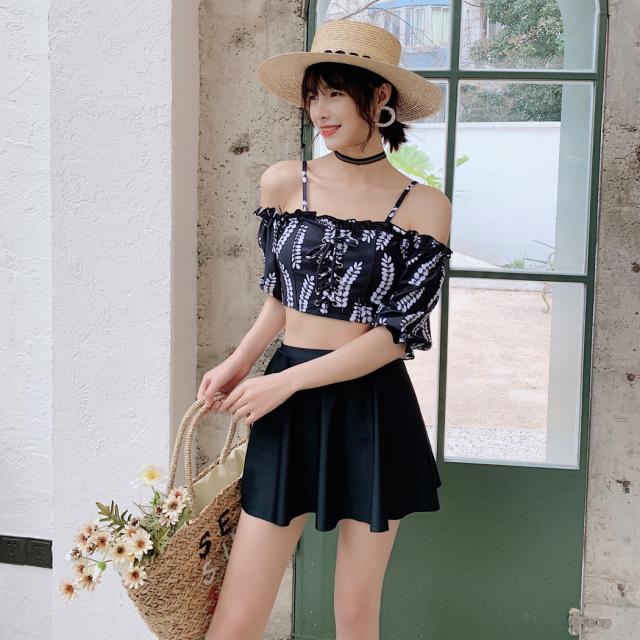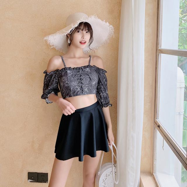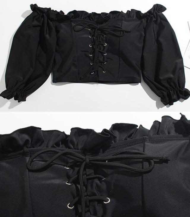 水着 レディース ビキニ オフショルダー 2way フリル スカート 3点セット 体型カバー水着 ぽっちゃり 20代 30代 ママ水着 バックフリル セクシー シンプル レースアップ オトナ女子 パッド付き バスト 盛れる 二の腕 お腹 お尻 太もも カバーアップ 黒