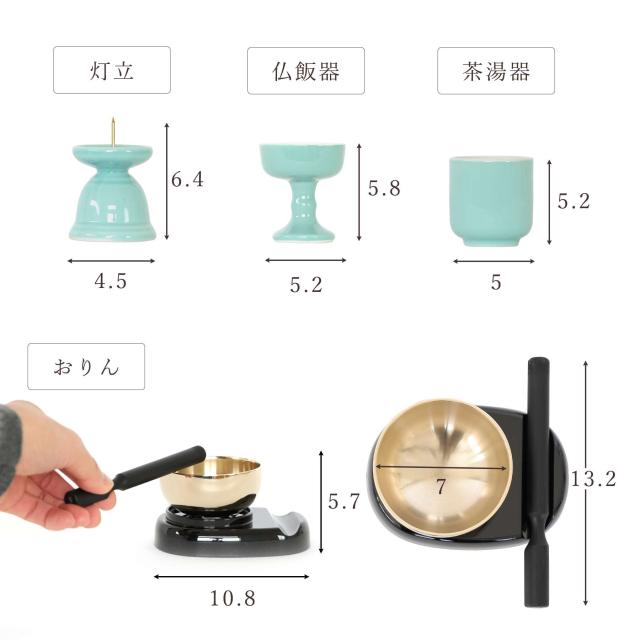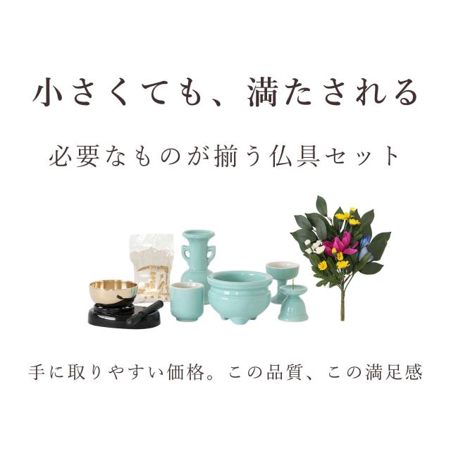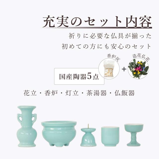 仏具 セット ミニ おりん 3点+陶器5点(青磁 青地 ブルー)+香炉灰+造花 仏花 仏具セット おしゃれ モダン 国産 日本製 仏壇セット モダン仏具 モダン仏壇 お盆 お彼岸 お墓参り お供え 供養 法事 法要