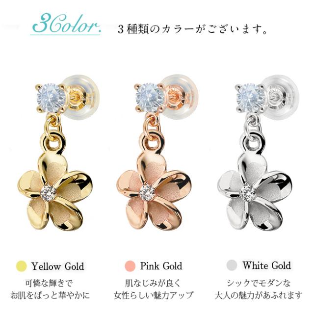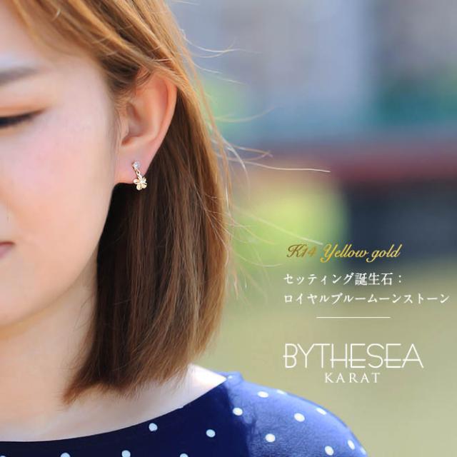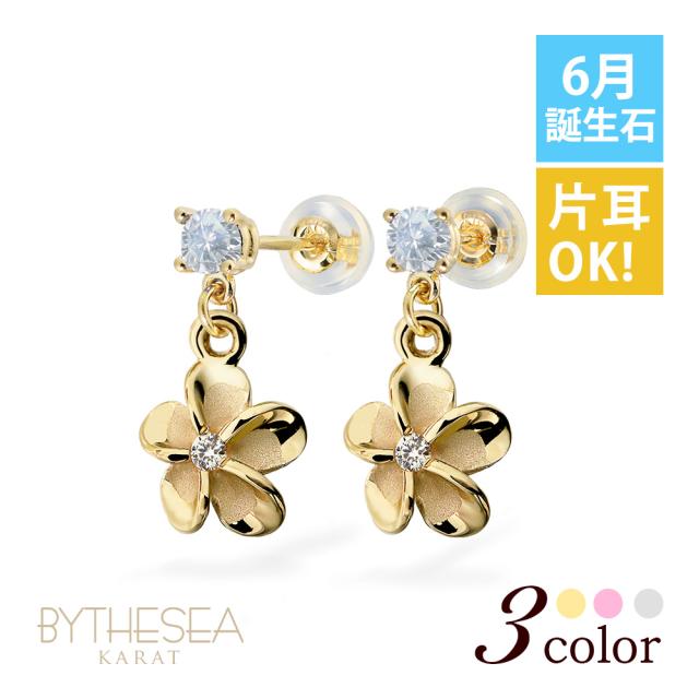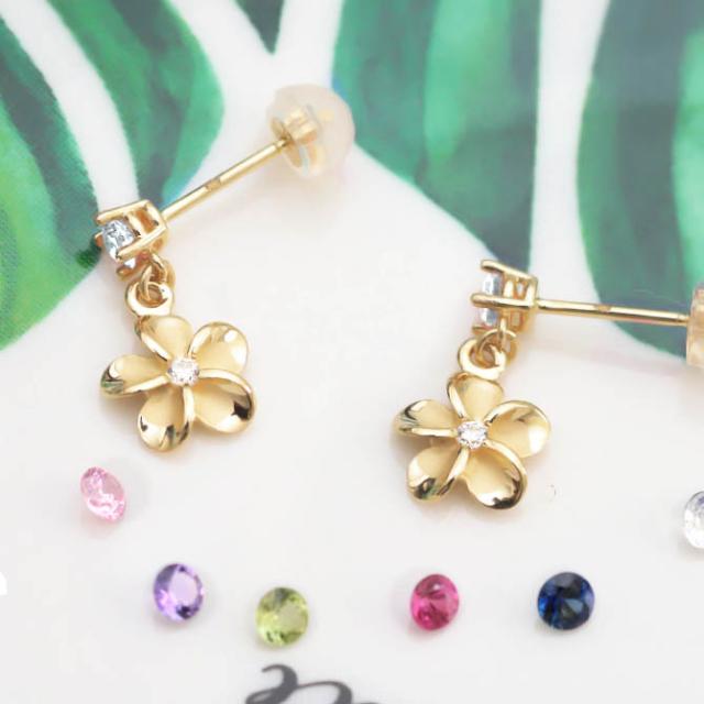 ハワイアンジュエリー ゴールド ピアス プルメリア 6月の誕生石 ロイヤルブルームーンストーン ジルコニア イエロー ピンク ホワイト 選べる 片耳(1個)購入可 K14イエローゴールド シリコンキャッチ プレゼント バレンタイン 【品番:GE401-6】
