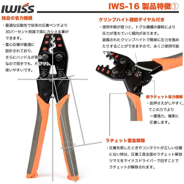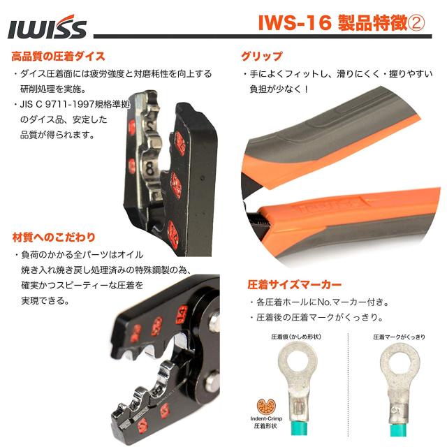 アイウィス IWISS 裸圧着端子 裸圧着スリーブ 圧着工具 JIS準拠品 圧着ペンチ 裸端子 圧着 工具 ペンチ DIY 作業 整備 自動車 車 バイク 電工 配線 1.25-16.0sq対応 IWS-16
