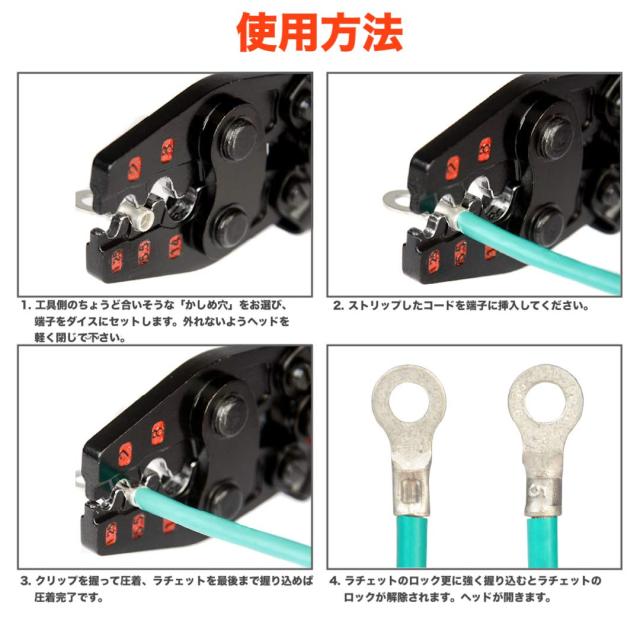 圧着能力:1.25mm2/16ゲージ、2.0mm2/14ゲージ、5.5mm2/10ゲージ、8.0mm2/8ゲージ、14mm2/6ゲージ