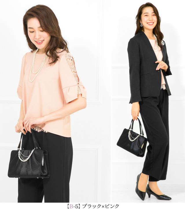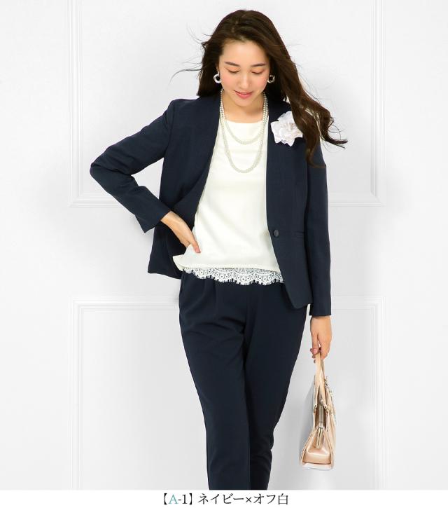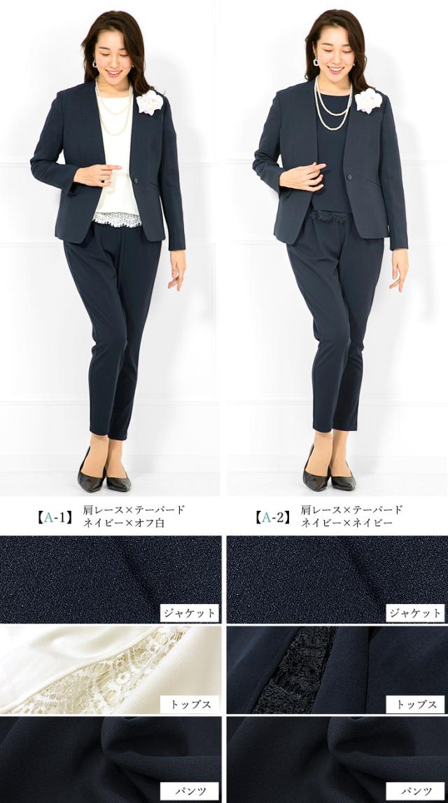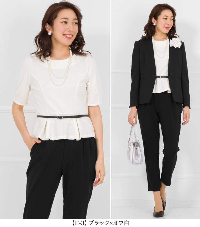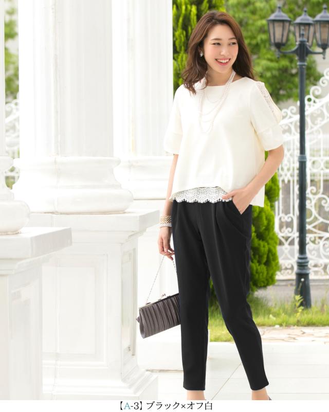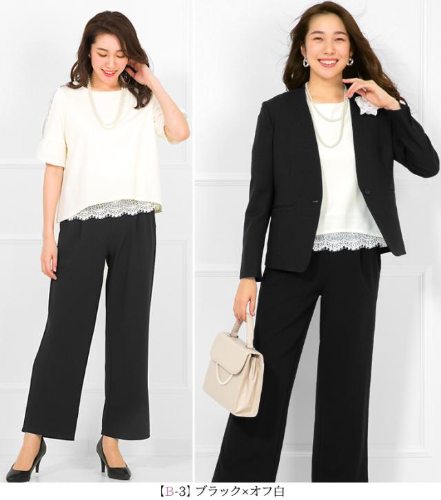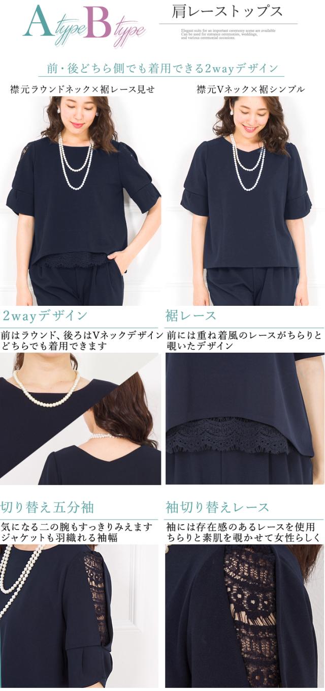 トップスは伸縮自在なストレッチ素材のカットソー。華やかな肩レース生地のプルオーバーかベルト付きのペプラムトップスからお選び頂けます。スーツのインナーとしても、普段使いにも着回しできます。