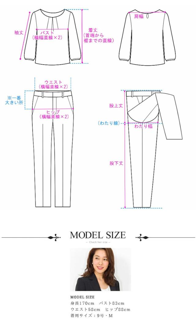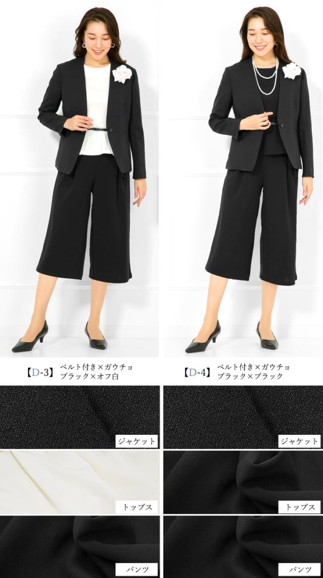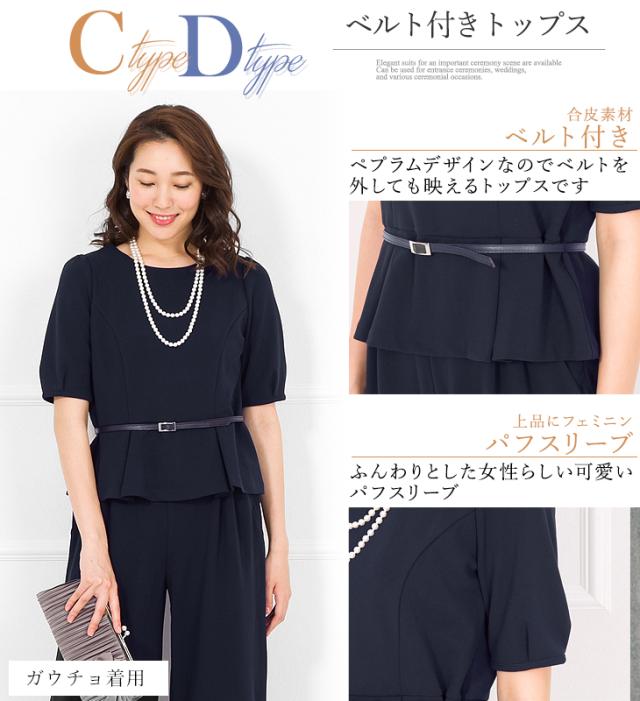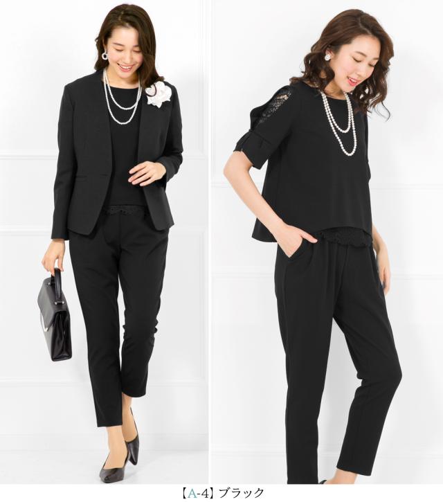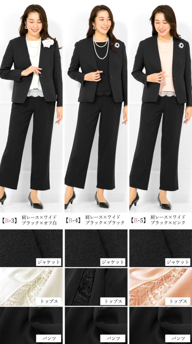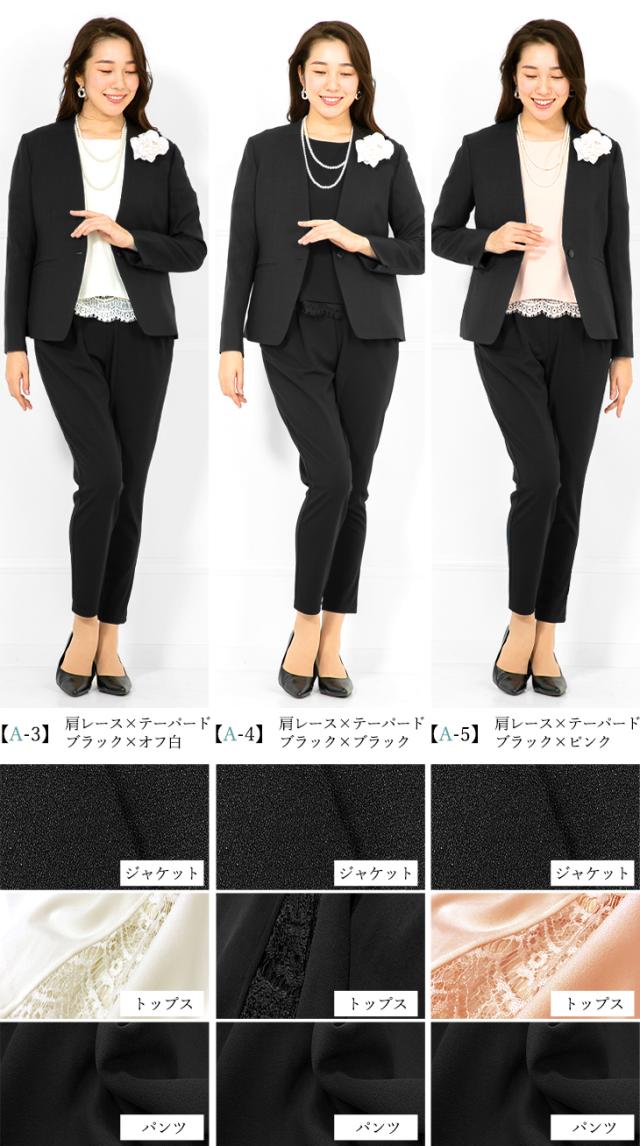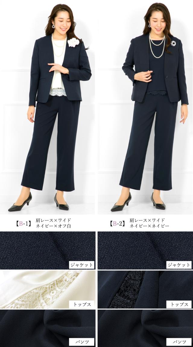 トップスは伸縮自在なストレッチ素材のカットソー。華やかな肩レース生地のプルオーバーかベルト付きのペプラムトップスからお選び頂けます。スーツのインナーとしても、普段使いにも着回しできます。