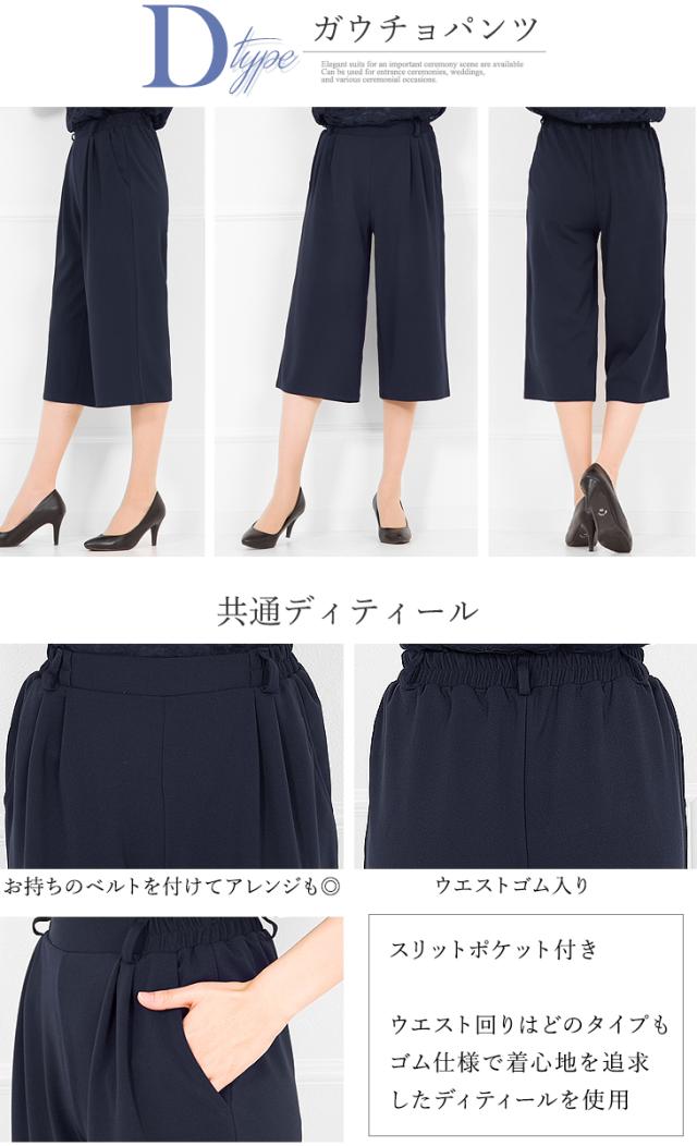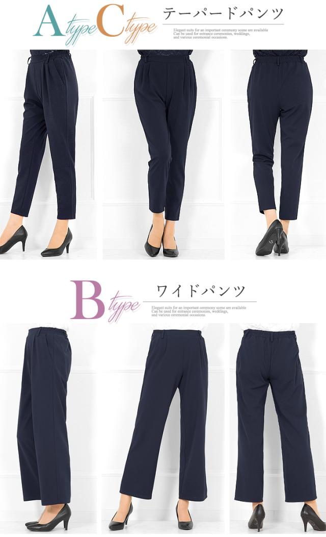パンツは美脚が叶うテーパードシルエットとエレガントに体型カバーできるワイドシルエット、ガウチョパンツからお選びいただけます。ぽっちゃりさんにもうれしいゆとりのあるヒップ回り。トップスと同くストレッチ素材なので動きやすい軽量さと、上下セットでパンツセットアップやパンツドレスとしてもコーディネートできます。