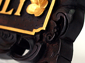 文字は貼り付けでは無く、周りを彫って立体的にしています。文字の周りのランダムな点々は、文字を立体的に見せる工夫ですと職人さんが言っていました。こだわってくれています。