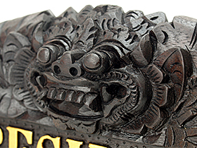 バリの伝統の技が光る、バロンデザインの彫刻プレートです。バロンとは、インドネシアのバリ島に伝わる獅子の姿の聖獣で、善の象徴とされています。バリ・ヒンドゥーでは、バロンはあらゆる災害を防ぐ力をもつと信じられています。