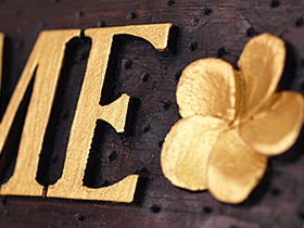 プレートの素材は、チークになります。カラーはダークブラウン。フレームのデザインはロータス、文字や飾り(プルメリア)はゴールドです。