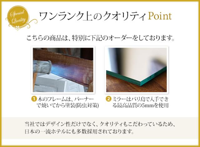 こちらのミラーはバリで手に入る最高ランクのミラー(厚みが5mmのもの)を使っています。通常安価なミラーは3mmタイプですが、サイズが大きくなるとゆがみが生じることがあります。グレードが上がる分、お値段も少し上がりますが、5mmタイプの方がより正確に映る鏡であると言えます。