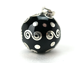 太陽をモチーフにしたガムランボールです。黒い部分は真鍮にレジン(樹脂)加工して仕上げています。ブラックにシルバーの模様がよく映えます。