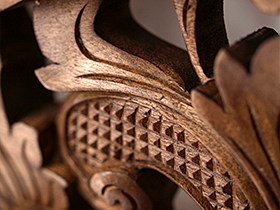 当店ではよりクオリティの高いモノをご提供するために、アルベシアではなく、チュンパカという高価な木を採用。チュンパカはアルベシアに比べ、丈夫で目が細かく、木目が目立たないという特徴があります。日本で買うと数十万円する精巧な木彫りのレリーフやオブジェも、ほとんどがこのチュンパカを使用して製作されています。
