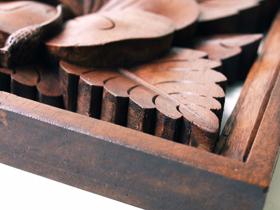 当店ではよりクオリティの高いモノをご提供するために、チュンパカという高価な木を採用。チュンパカはアルベシアに比べ、丈夫で目が細かく、木目が目立たないという特徴があります。日本で買うと数十万円する精巧な木彫りのレリーフやオブジェも、ほとんどがこのチュンパカを使用して製作されています。
