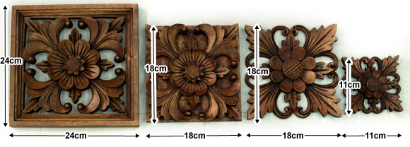 お花デザインの木彫りのレリーフは4種類ございます。左から枠付き木彫りのレリーフ(お花)、木彫りのレリーフ(お花)(このページ)、木彫りのレリーフ(お花2)、木彫りのレリーフ(お花2)ミニサイズです。