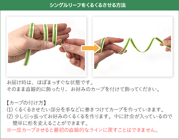 実際にはシングルリーフという植物はありませんが、細長い葉っぱをイメージして作られています。直線的に使用したり、カーブさせたり、らせん状にしたり、アートなデザインができます。ヤブランに似ています。