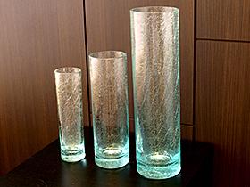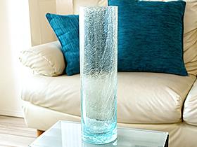 癒しの楽園バリ島の爽やかな淡いブルーのガラス製フラワーベース(花瓶)です。厚みがあって、手作りの温もりを感じる作品です。円柱形のシンプルなデザインで飾るお花を選びません。