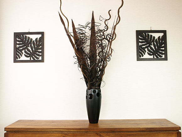 フラワーベースのみの販売です。お手持ちのリーフや当店の造花を自由に飾ってください。写真はリーフや枝がセットになった、チークのアートオブジェ(セット)です。 (壁にかかっているモンステラのレリーフはこちら)