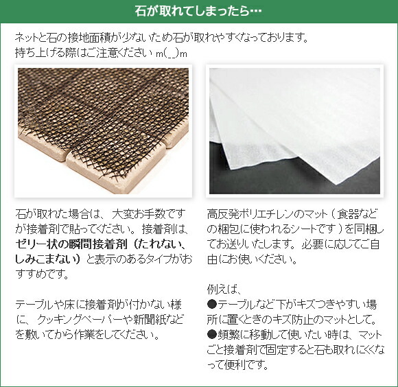 ネットと石の接地面積が少ないため、石が取れる場合があります。持ち上げる際はご注意ください。