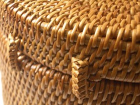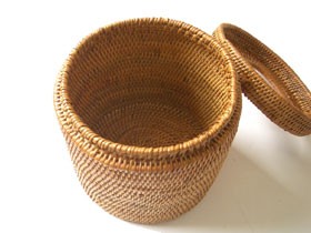 アタは主にインドネシアで自生するシダ科の植物で、アトゥとも呼ばれています。その茎の部分を裂いて編み込んでいきます。約1週間程日干した後、ココナッツの実を裂いてチップにしたもので燻します。燻すのは防虫・防カビが目的ですが、燻すことによりアタ製品独特の香りとアメ色に仕上がります。