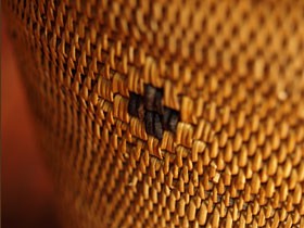 アタは主にインドネシアで自生するシダ科の植物で、アトゥとも呼ばれています。その茎の部分を裂いて編み込んでいきます。約1週間程日干した後、ココナッツの実を裂いてチップにしたもので燻します。燻すのは防虫・防カビが目的ですが、燻すことによりアタ製品独特の香りとアメ色に仕上がります。