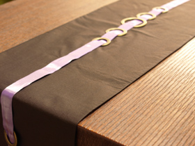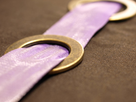 ダークブラウンの生地に光沢のあるパープルのリボンと真鍮の輪っかを組み合わせたデザインです!輪っかは中心部に5つ、端から約40cmくらいのところに各1つずつついています。大きさはまん中を中心に少し小さくなります。