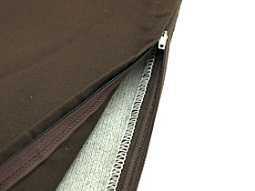 裏地がついていますのでしっかりした作りになっています。横ファスナーのデザインで、ファスナー部分の色は、クッション地に合ったブラウンカラーです。