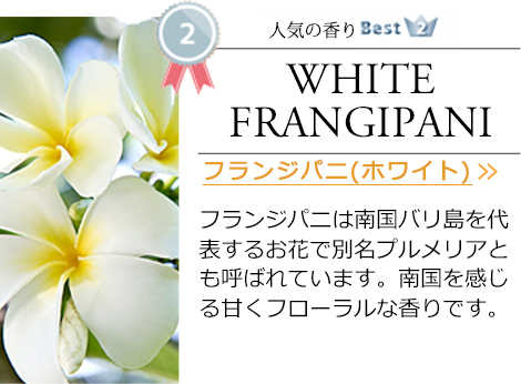 フランジパニは南国バリ島を代表するお花で別名プルメリアとも呼ばれています。南国を感じる甘くフローラルな香りです。