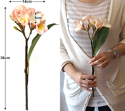 かわいらしい色合いのプルメリアの造花です。枝付きなのでそのまま花瓶に挿して飾ることができます。