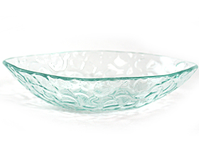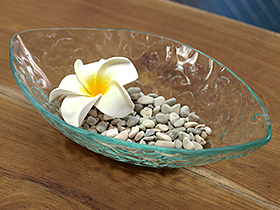 癒しの楽園バリ島のスパやリゾートホテルで使われているガラス製ボウルです。バリの爽快な海をイメージするグリーンがかったカラー。ハンドメイドの温もりを感じるガラスボウルです。アーモンドのような形で、フランジパニ(プルメリア)のお花模様がとてもかわいらしいです。