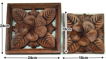 プルメリアデザインの木彫りのレリーフは2種類ございます。 左:枠付き木彫りのレリーフ(プルメリア)(このページ) 右:木彫りのレリーフ(プルメリア)