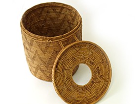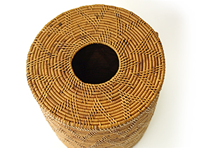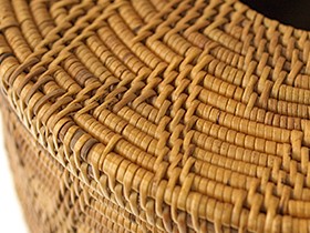 アタは主にインドネシアで自生するシダ科の植物で、アトゥとも呼ばれています。その茎の部分を裂いて編み込んでいきます。約1週間程日干した後、ココナッツの実を裂いてチップにしたもので燻します。燻すのは防虫・防カビが目的ですが、燻すことによりアタ製品独特の香りとアメ色に仕上がります。