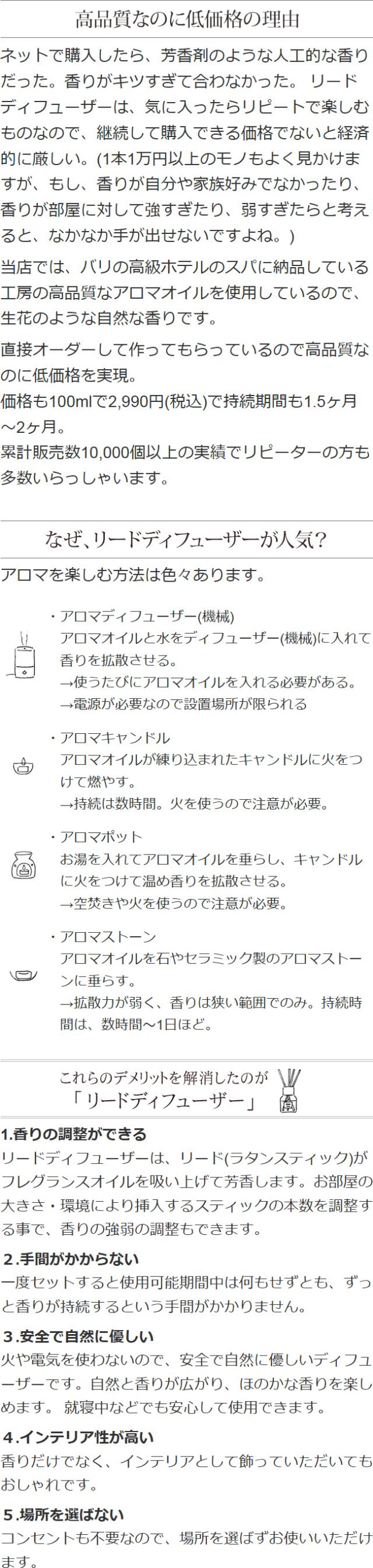 リードディフューザーは、リード(スティック)がフレグランスオイルを吸い上げて芳香します。 火や電気を使わないので、安全でナチュラルな芳香を楽しめます。