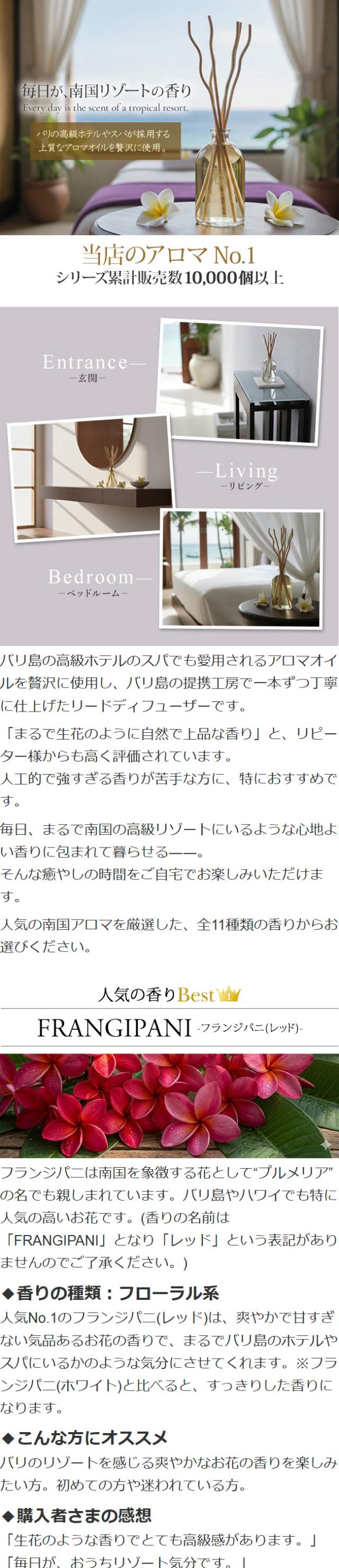 - フランジパニを購入。香りは充分満足のいく広がりがあります!10本入りのスティックで瓶にはMAX7本入ります。3本でほのかに香る感じなのでお部屋の置く場所によって調整できそうです。開けるのは確かに手間がかかりましたが、ソコも海外っぽく楽しめました!