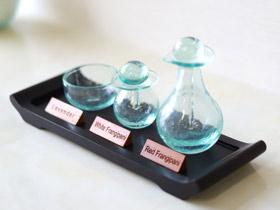 ウッドトレイ(チーク)S (28cm×9cm)にボウルSガラス、オイルボトルSガラス、オイルボトルMガラスをのせたイメージです。Sサイズのトレイはコンパクトにスッキリまとまります。