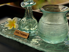 バリのスパでもガラスのピッチャーやプレート ガラス(フランジパニ)と一緒に飾っています。