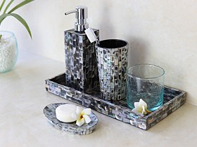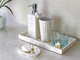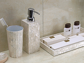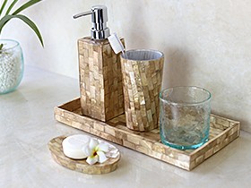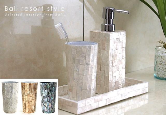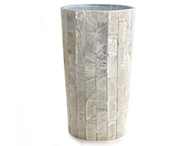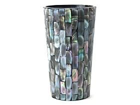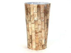 シンプルなグラス型の歯ブラシスタンドです。貝殻をモザイクタイル状にして貼り合わせて作る手間のかかる一品です。