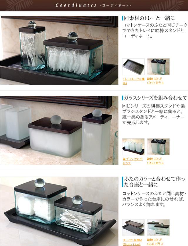 ガラスと木(チーク)を組み合わせたコットンケースはほっとする優しい佇まいで、バリを思わせます。毎日使うアメニティグッズや髪留め、シュシュなどのアクセサリーを収納すれば、洗面所で、極上リゾートホテルの非日常感が味わえます。