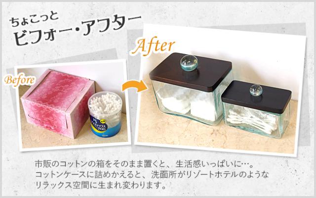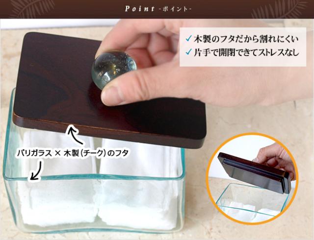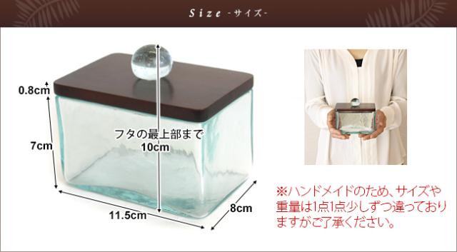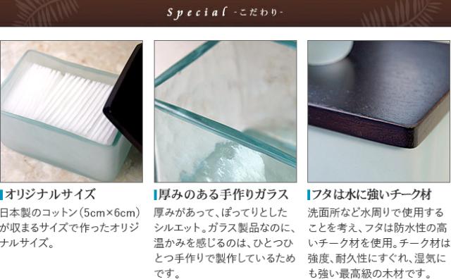 バリのリゾートホテルに泊まったとき、パウダールームにガラスのコットンケースが置いてありました。ガラスと木の温かい雰囲気に癒され、ずっと見つめてしまったのを覚えています。コットンが10枚くらい入るもっと小さいサイズだったのですが、日本でも使いやすい大きさがあったらいいなと思い、オリジナルサイズをオーダーすることになりました^^