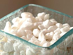 爽やかな白いナチュラルストーンをお付けします。バリでも実際にベースに使われているナチュラルストーンです。ナチュラルストーンを入れることで、大きな植物を入れたときにも倒れにくくなりますし、お花の角度や高さなど、バランスを調整しやすくなります。