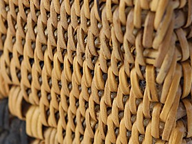 アタは主にインドネシアで自生するシダ科の植物で、アトゥとも呼ばれています。その茎の部分を裂いて編み込んでいきます。約1週間程日干した後、ココナッツの実を裂いてチップにしたもので燻します。燻すのは防虫・防カビが目的ですが、燻すことによりアタ製品独特の香りとアメ色に仕上がります。