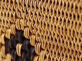 アタは主にインドネシアで自生するシダ科の植物で、アトゥとも呼ばれています。その茎の部分を裂いて編み込んでいきます。約1週間程日干した後、ココナッツの実を裂いてチップにしたもので燻します。燻すのは防虫・防カビが目的ですが、燻すことによりアタ製品独特の香りとアメ色に仕上がります。