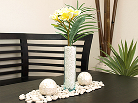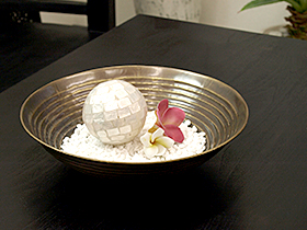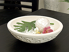 フランジパニのボウルにシェルのボールを1個飾ったイメージ。