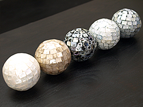 天然のシェルが美しいインテリアボール(球体)です。貝殻をモザイクタイル状にして貼り合わせて作る手間のかかる一品です。