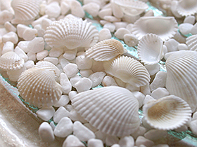 名わき役のご紹介。白くて小さい貝たちと、ナチュラルストーン(小石)。貝同士の隙間を埋めて、全体を一つにまとめてくれます。