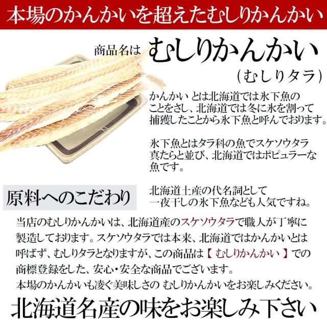 本来、『 むしりかんかい 』というと、北海道の方は氷下魚(こまい)を干し、むしった物をむしりかんかいと言いますが、こちらの商品は北海道産のスケソウタラを原料に使用した『むしりたら』となります。商品名を『むしりかんかい』と言い、大変ご指摘の多い商品でございますので、初めにご案内させていただきます。※商標登録済の安心なお品物です