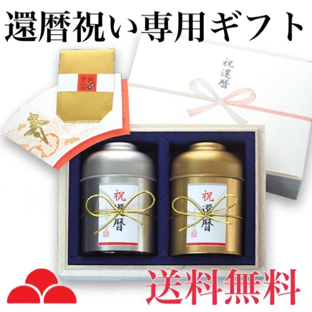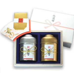 お茶に入れる金箔と「祝還暦」のおのし付きです。