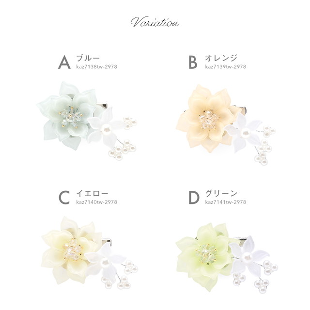 透明感のある樹脂で花びらが作られた、清涼感溢れるデザインです。花の中心にはクリアビーズやフェイクパールが施され、優美な印象です。