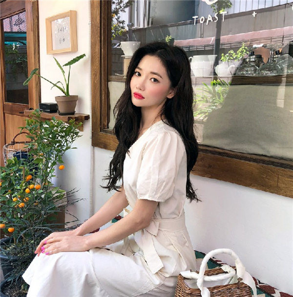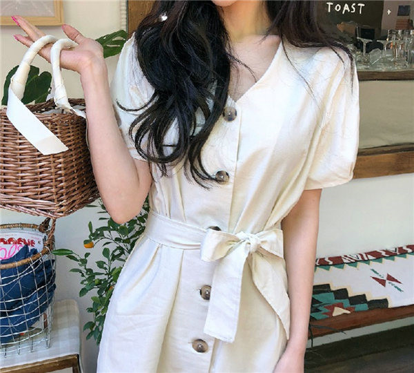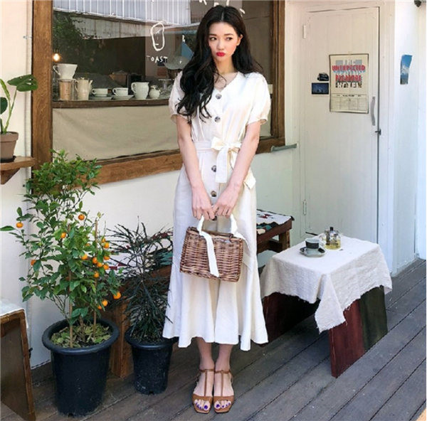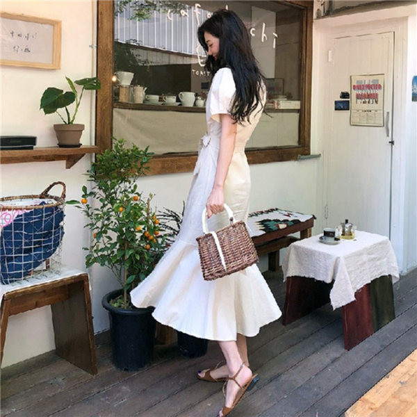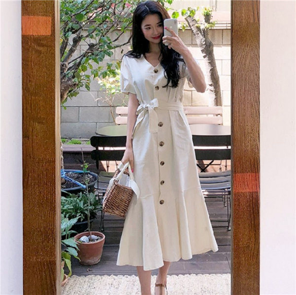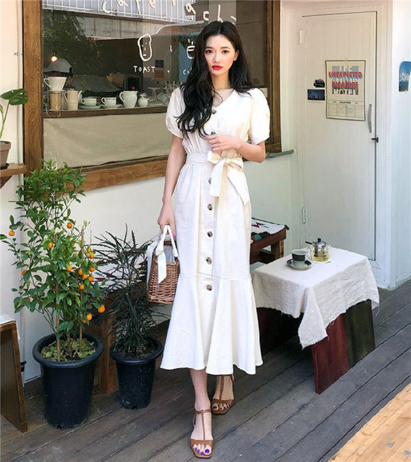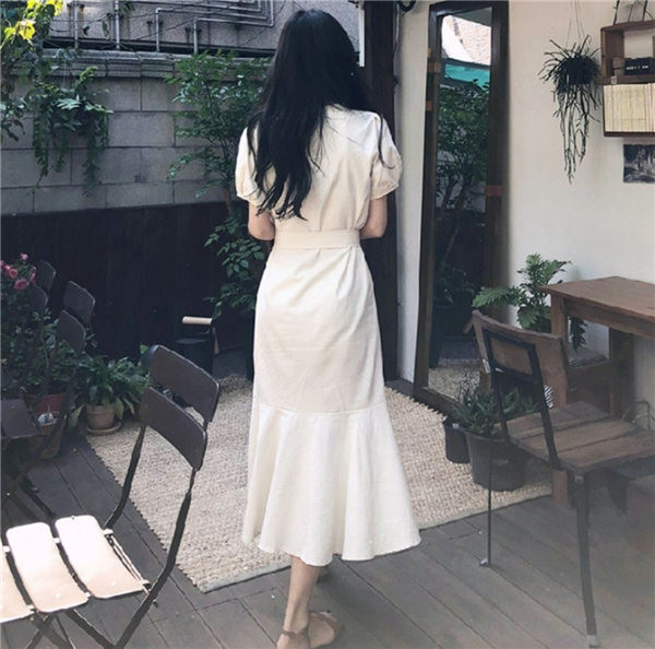 送料無料 即納 ワンピース レディース シャツワンピース 半袖 バルーン パフスリーブ 膝下丈 vネック Aライン ロング ミモレ丈 マーメイド マキシワンピース 春 夏